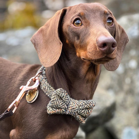 Harris Tweed is made from 100% pure virgin wool, dyed, spun and finished in the Outer Hebrides and woven by hand by the Islanders. That's why we only use the best when handmaking your luxurious Harris Tweed Dog Collar, Bow and Lead Sets so your pooch can look adorable on dog walks.